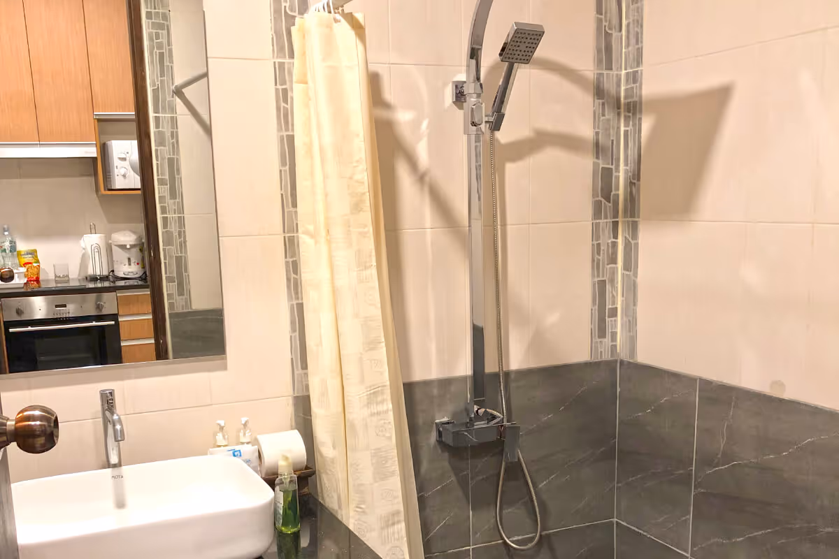 Fully furnished with a European kitchen, stylish living areas, and a 50" TV