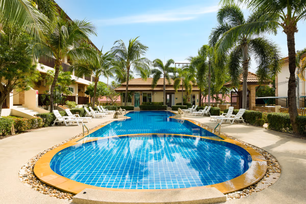 Enjoy the perks : a car park, access to two pools, lush gardens, and a captivating waterfall.