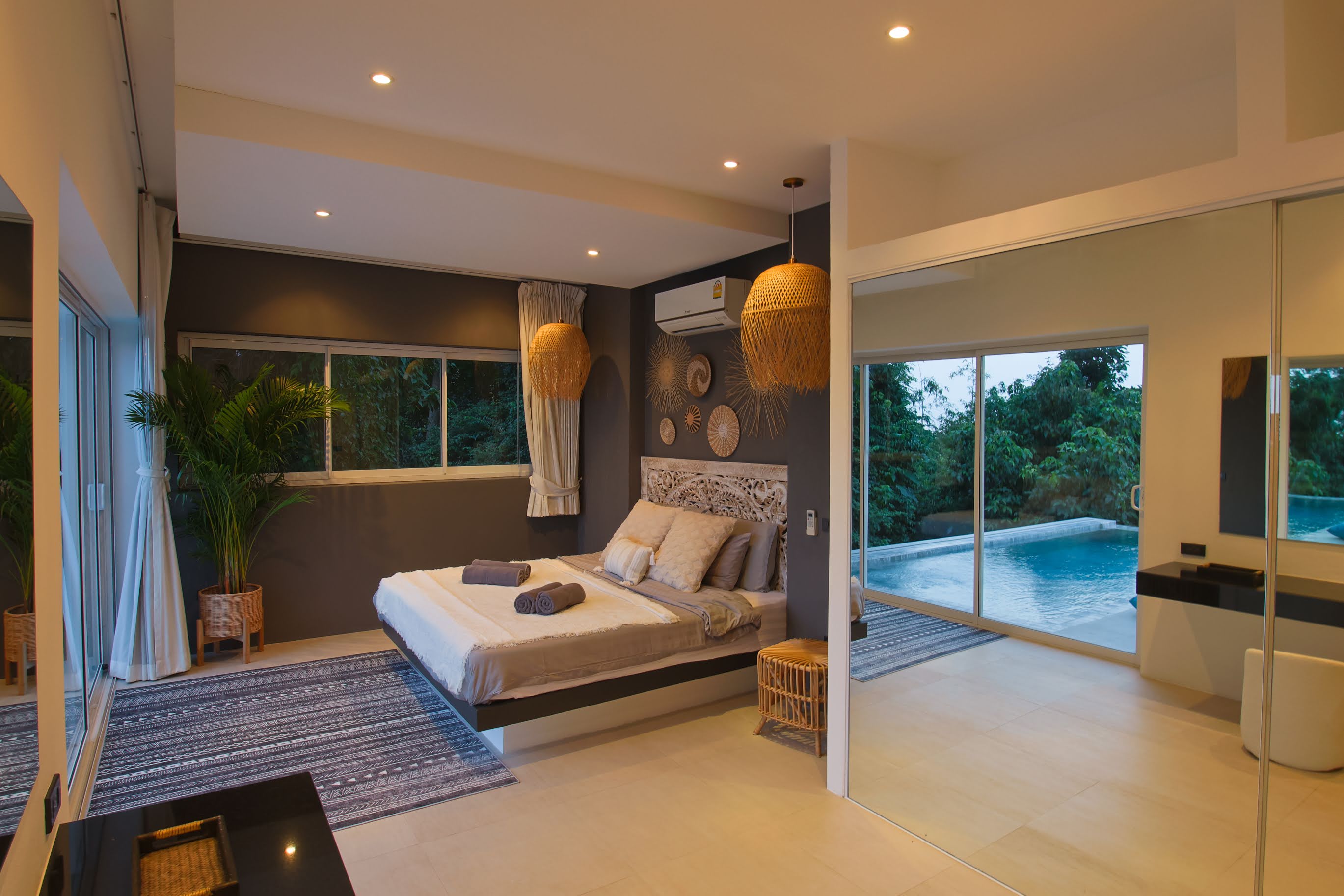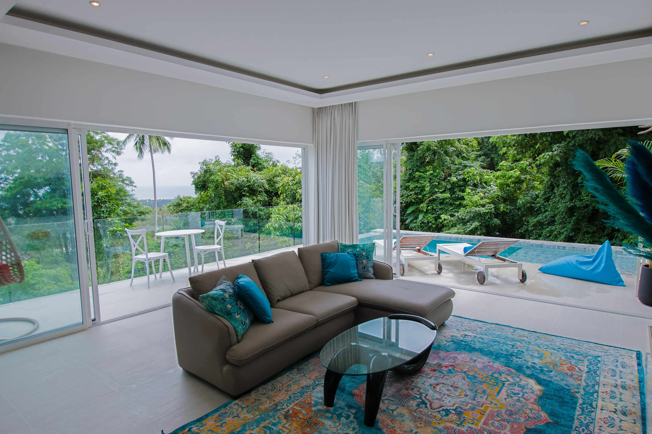 The open-plan living area is bright and airy, with floor-to-ceiling glass doors that connect seamlessly to the outdoor terrace and private pool. Both bedrooms are spacious and stylishly decorated, each with ensuite bathrooms and a calm, resort-like atmosphere.