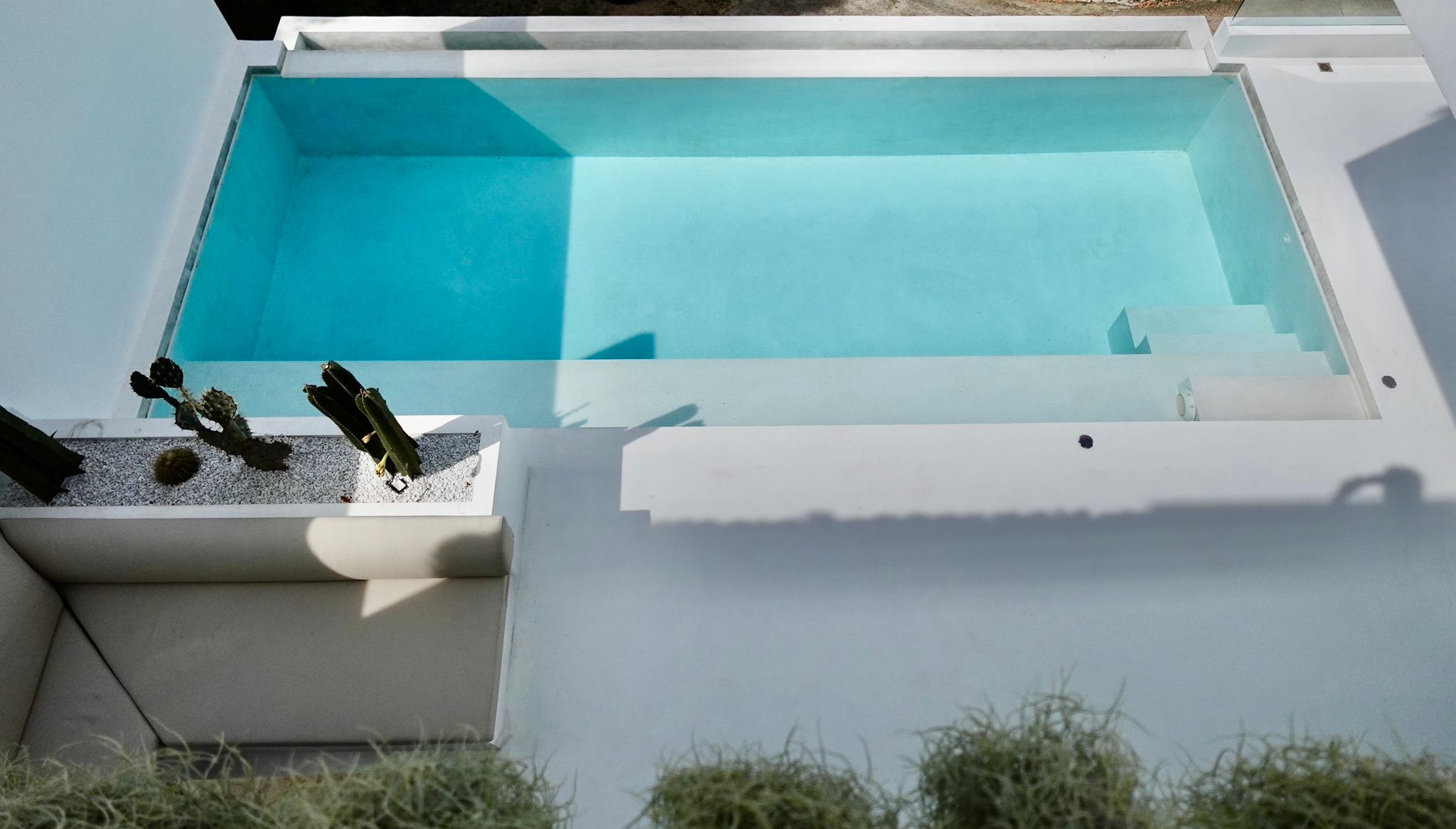 - Water system: rainwater collection + truck delivery, with a large underground concrete tank located beneath the pool for sustainable water storage